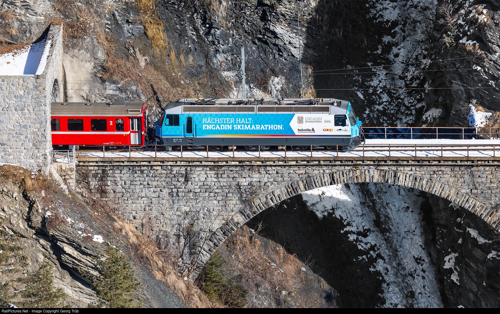 | Ge 4/4 III # 649 of the Rhaetian Railway, in the publicity paint scheme for the Engadin Skimarathon, is pulling the IR 1133 of the line IR38 from Chur over the Albula line to St.Moritz, leaving the 300 meter long Mistailtunnel and crossing the 32 meter long and about 20 meter high Mistailtobel viaduct in the Schin groge between Solis and Tiefencastel. |