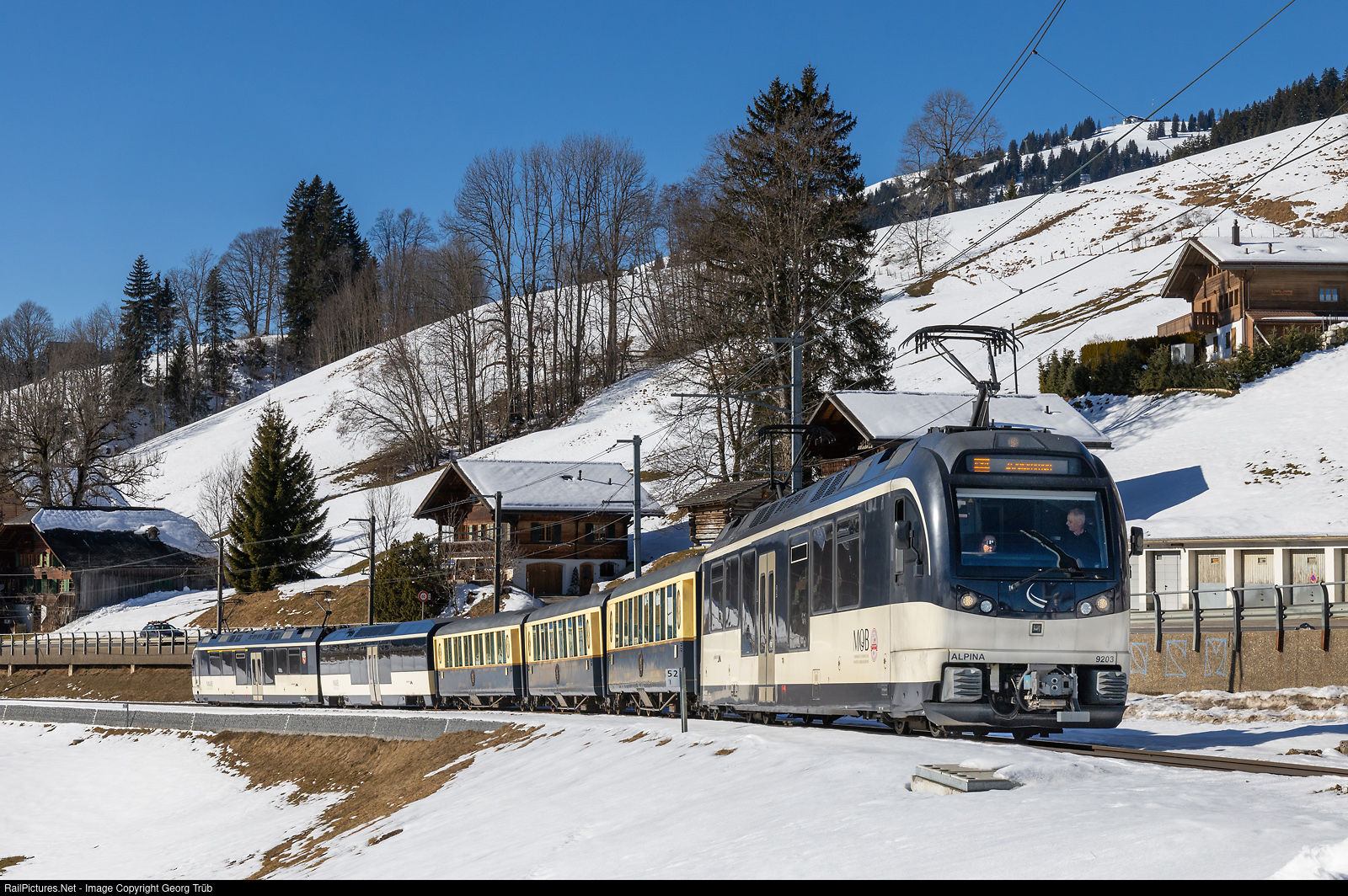 GOLDENPASS BELLE EPOQUE train PE 2214 of the line PE30 of the MOB (Montreux Oberland Bernois) from Montreux via Gstaad to Zweisimmen, between Schönried and Saanenmöser. In front ALPINA railcar Be 4/4 9203 (StadlerRail), followed by "Belle Epoque" cars Brs # 201, As # 103 and # 107, partly lowfloor Bs # 233 and ALPINA railcar ABe 4/4 # 9303 in the rear.