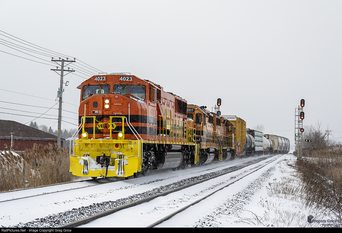 On January 29th, 2025, St. Lawrence & Atlantic Railroad train 520, led by EMD SD70MAC #4023, crosses from Track 1 to Track 2 at Davis on the CN St-Hyacinthe Subdivision in Saint-Basile-le-Grand, Quebec, Canada.