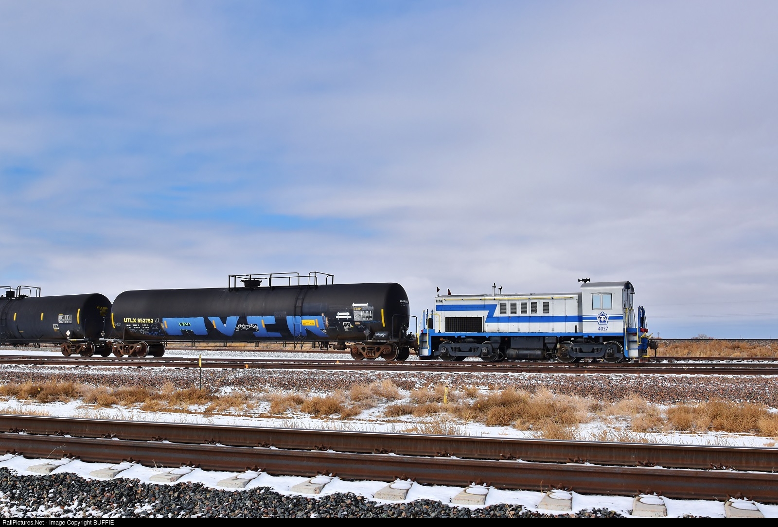 | Hudson Terminal Railroad's #4027 works the oil tanker yard in Hudson, Colorado. The diminutive switcher engine was built in the 1950's for the U.S. Army and later worked for the Royal Gorge Railroad in southern Colorado. |