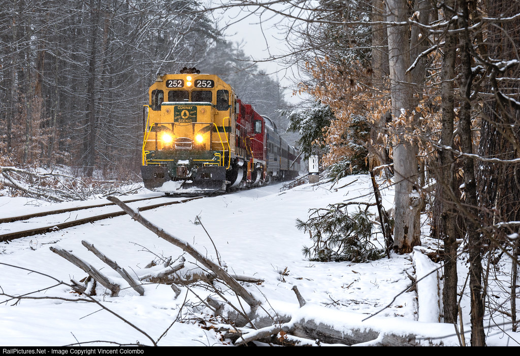 | Conway Scenic GP38 252 and 255 lead a passenger train near the Route 302 crossing in North Conway, NH. The train is just about to arrive back into North Conway after a 4 hour round-trip up the Mountain Division to Crawford's. The train is on the former B&M Conway Branch at MP 1, measured from Intervale where the railroad joined the MEC Mountain Division. |