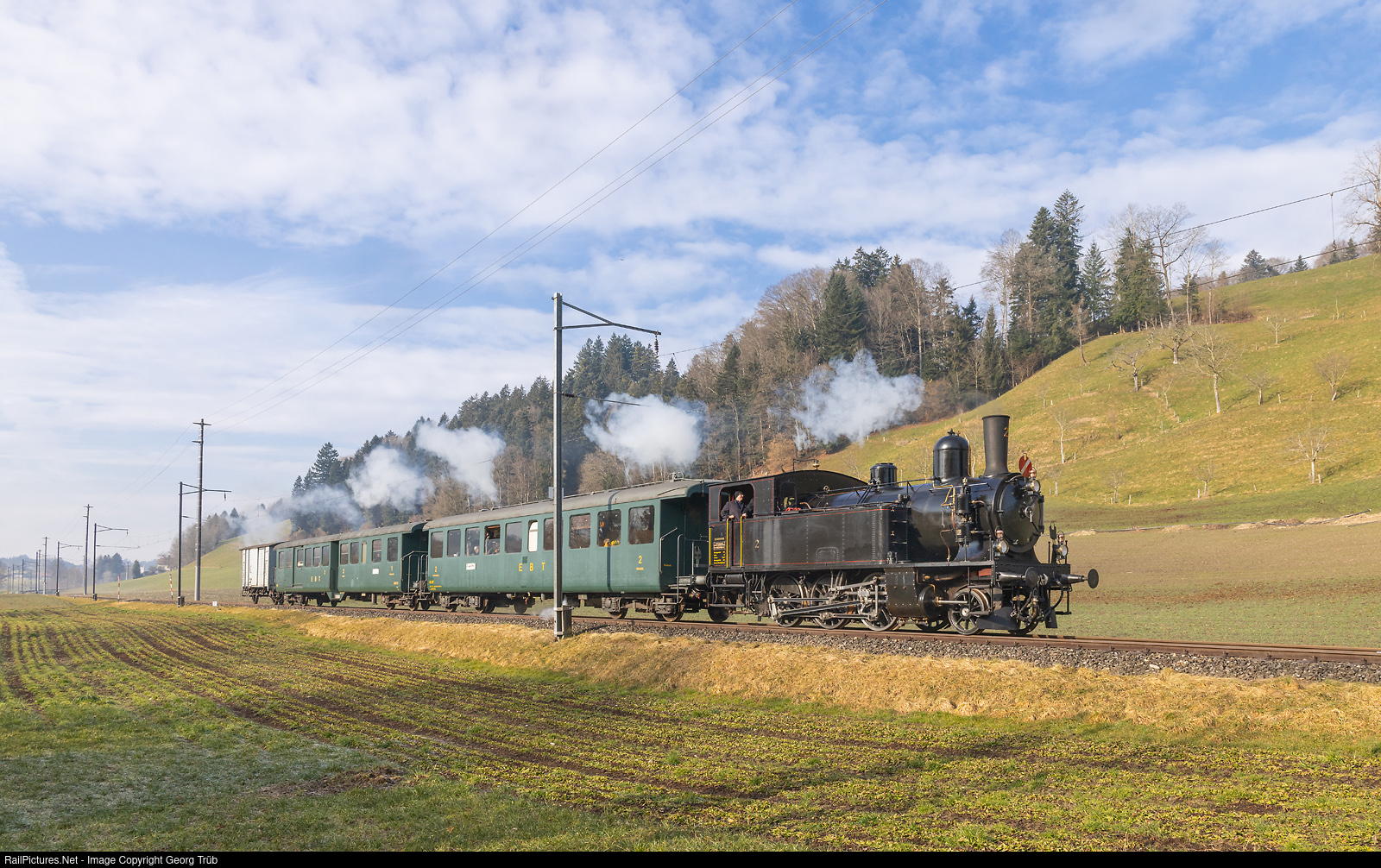 | Steamlocomotive Ed 3/4 # 2 of the Association VHE with the winter steam special from Sumiswald-Grünen to Huttwil, between Dürrenroth and Huttwil. The cars are second class Bi # 527 from 1947, combined first and second class with baggage compartment ABDi # 722 and covered freight car K2 # 34159. |