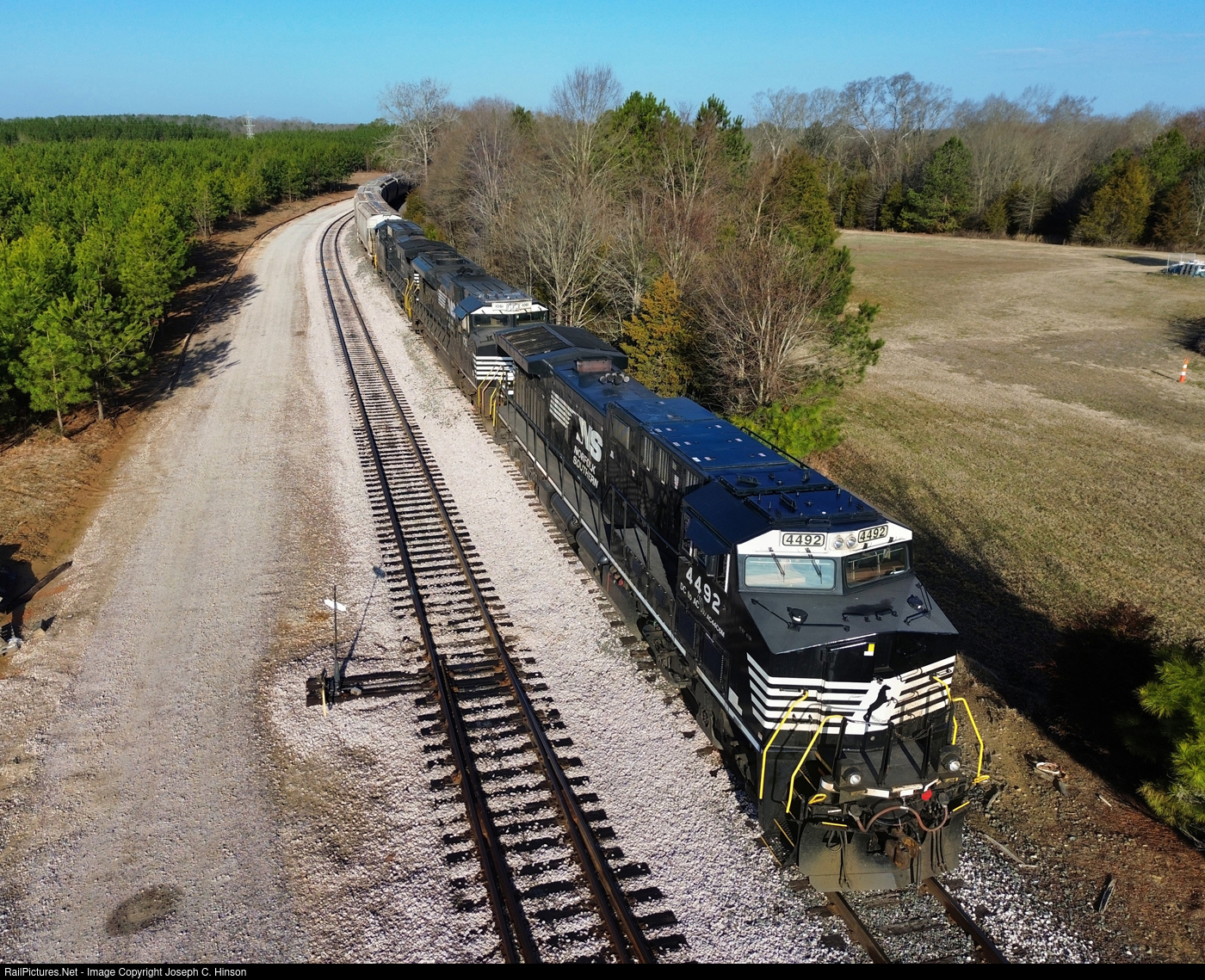 | Norfolk Southern AC44C6M is on the point of a grain train on the Lancaster and Chester that is idling near Circle S Feed Mill in the small village of Bascomville, South Carolina. NS 4492 was built by General Electric in 1998 as NS 9163, a GE C40-9W. Shot with Air Joe 1. |