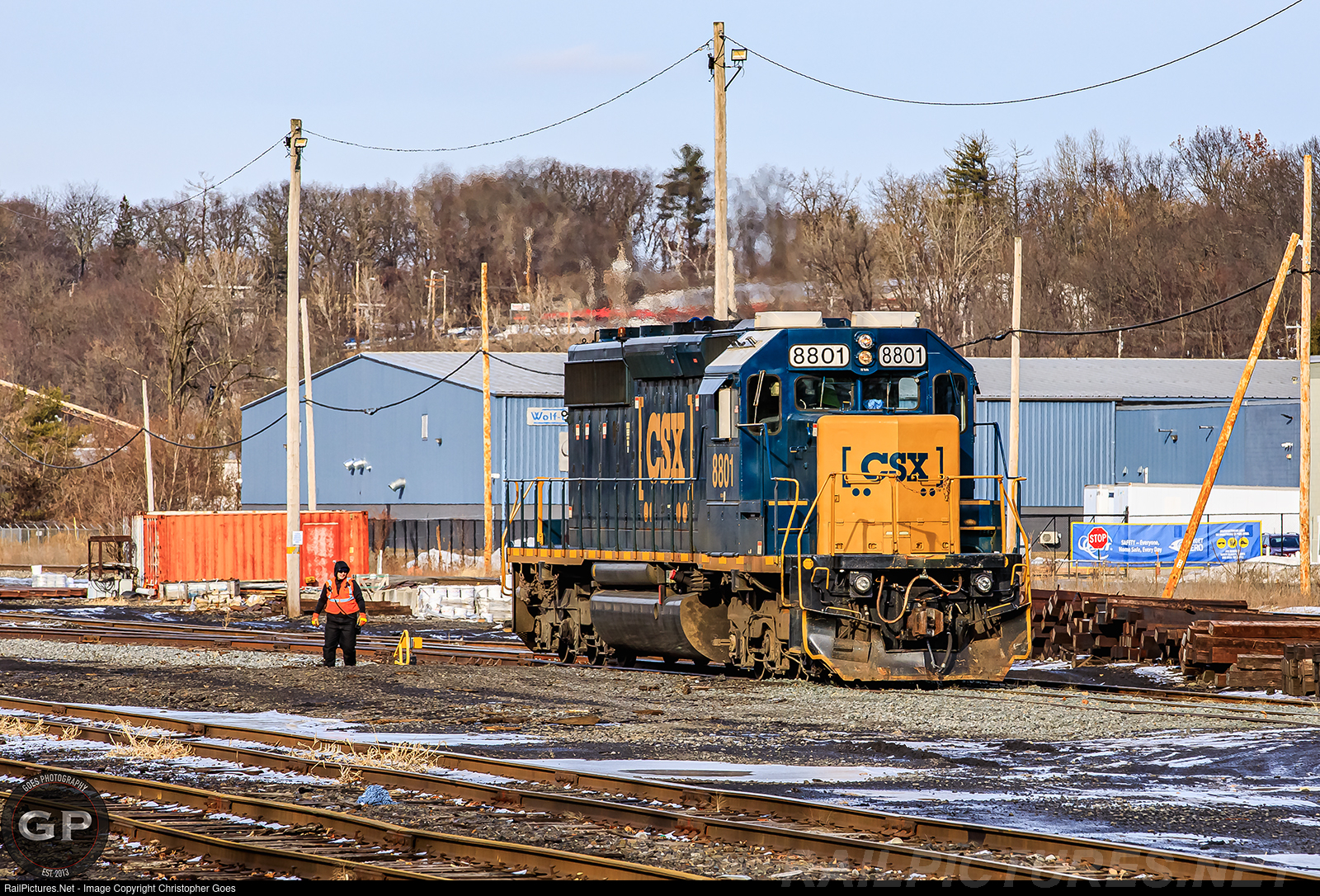 | Before the snow storm moved in; the L040 CSX 8801 made it's return trip to Kingston finishing up the days work & run up to Selkirk with the conductor making his way back up to the locomotive after tying his train down then throwing the switch to reverse back to the yard office & sign off for their weekend. |