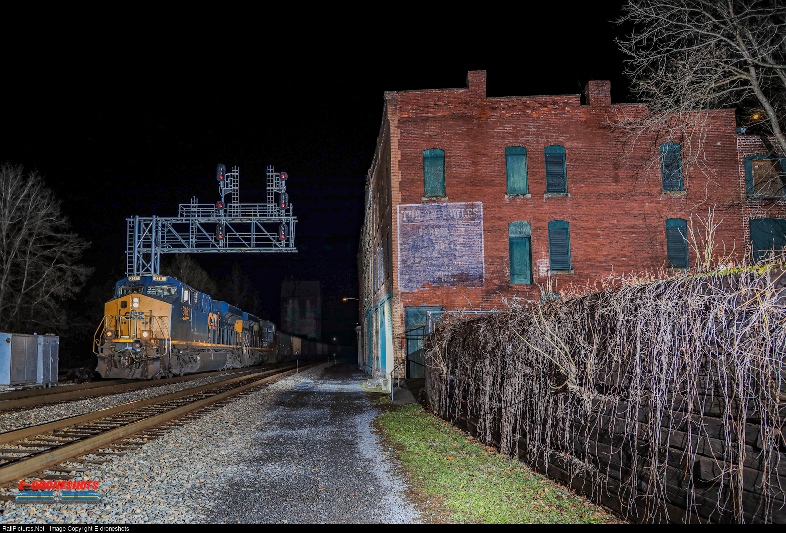 Breaking the silence of the night in Thurmond, CSX 3161 leads 110 loads of coal bound for export out of New Port News Virginia.