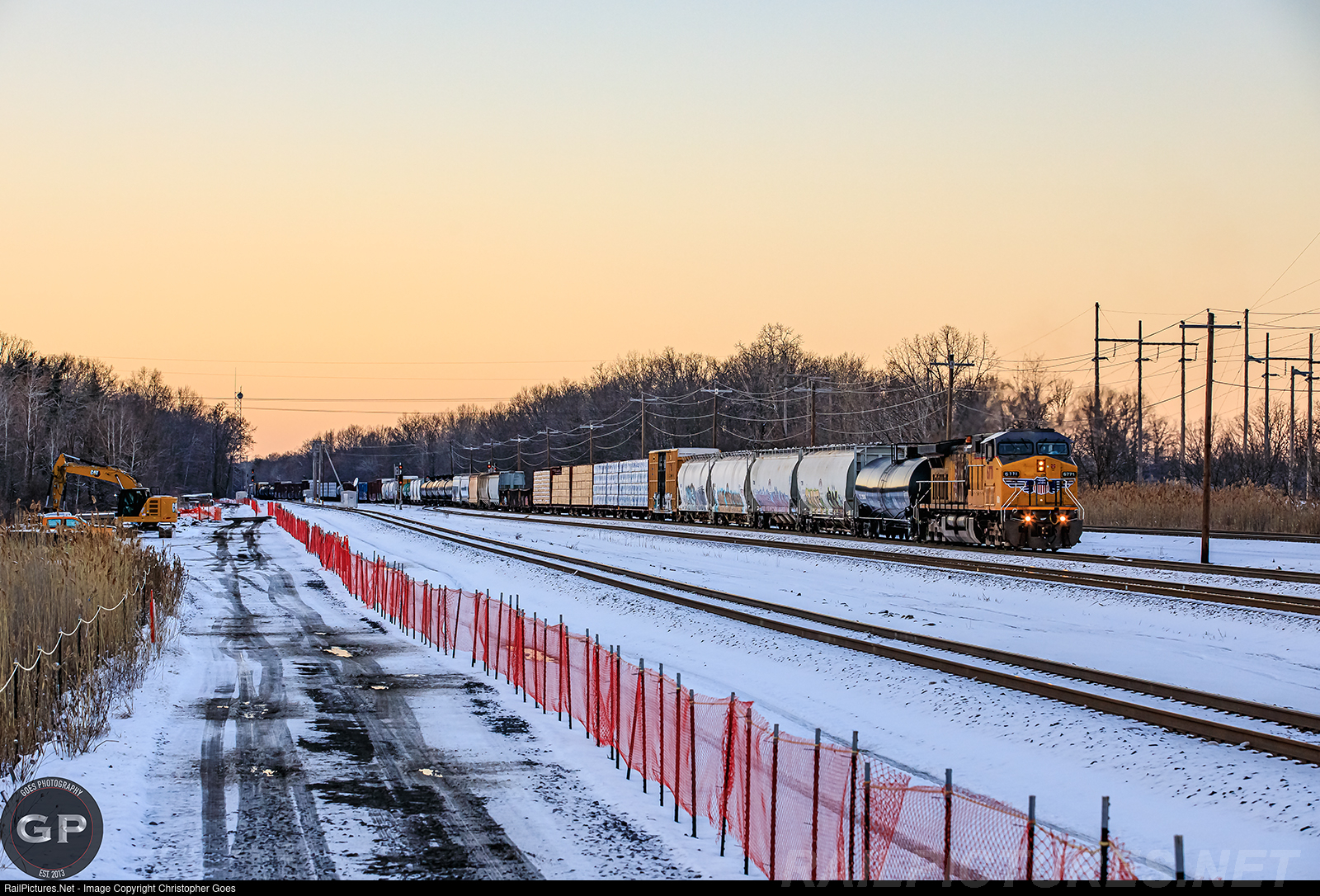 Work on the hydro line from Canada continues along the right of way as UP 6771 with a friendly crew from DeWitt leads the X368 through CP-FB crawling into the yard for Track 5 under the sunset sky.