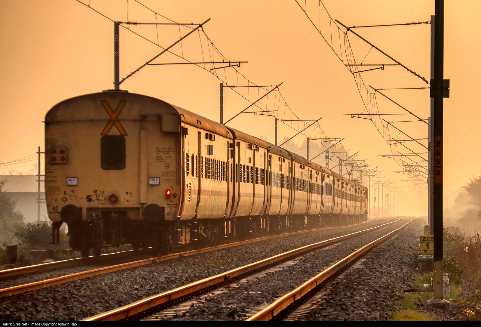 01511 Pune Baramati fast passenger proceeds towards Yewat for its next commercial halt under magical golden winter morning light.