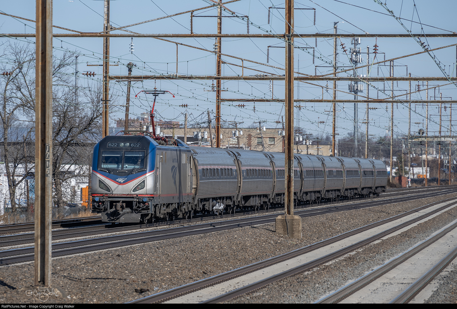 Amtrak Northeast Regional train 125 (Springfield, Massachusetts to Newport News, Virginia) speeds through the NJ Transit station in Linden, pulled by ACS-64 622. This section of Amtrak's 457-mile Boston MA to Washington DC electrified rail line is six tracks wide to accommodate both Amtrak and NJ Transit traffic. This train is diesel-powered from Springfield MA to New Haven CT, then electrified from New Haven to Washington DC, and once again powered by a diesel to Newport New VA. (Linden, New Jersey - February 5, 2025)
