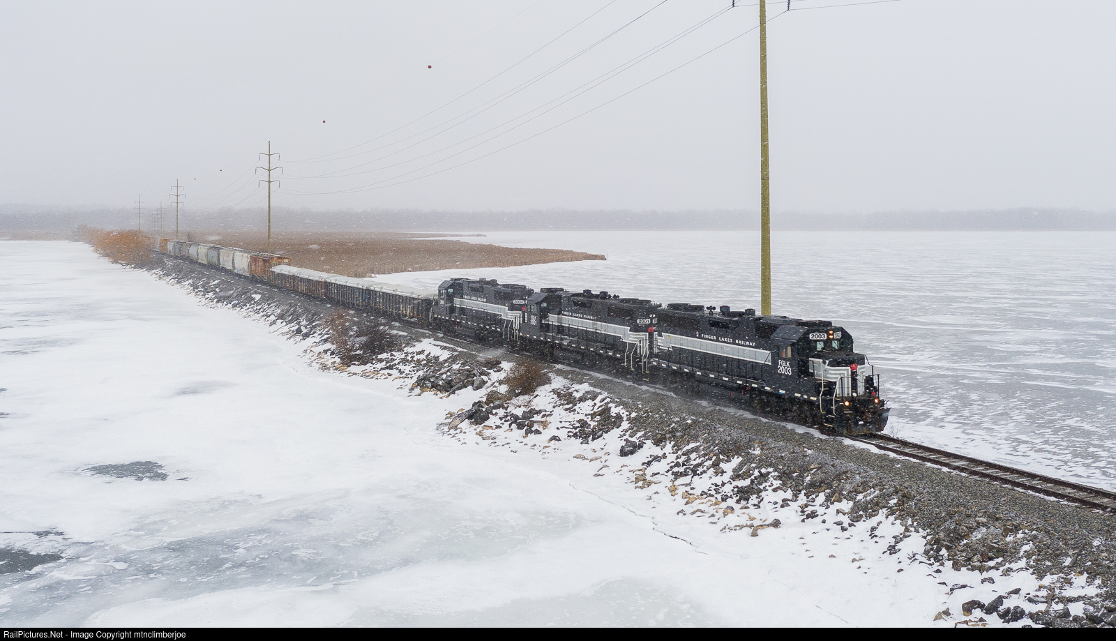 | A trio of Finger Lakes Railway GP38-2's lead the eastbound leg of the GS-2 as it rolls across the causeway that spans Cayuga Lake as a light snow falls. With the lake frozen, dozens of ice fisherman were out on the ice south of the causeway, out of frame from this scene. |