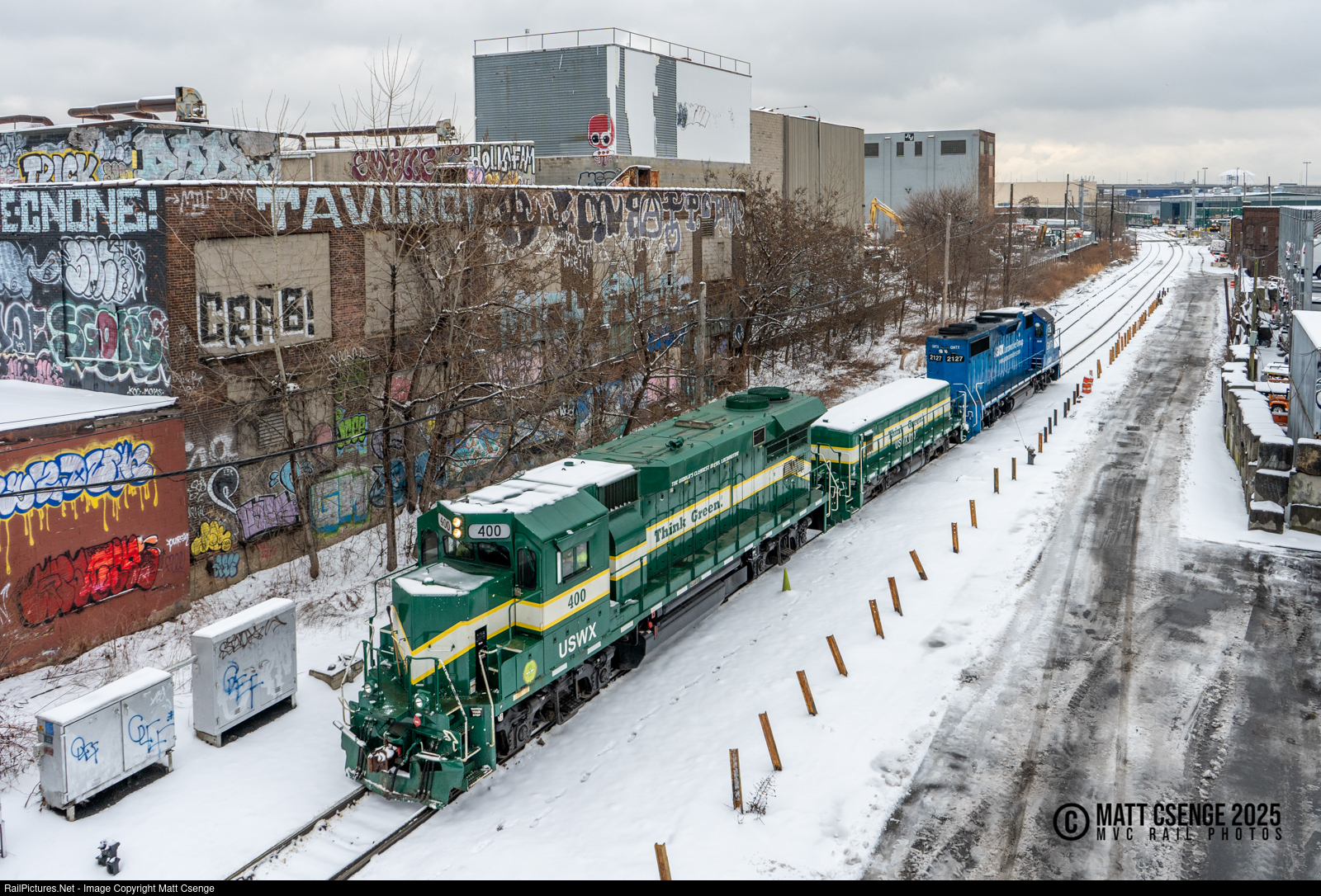 USA Waste Services SE23B-M no. 400 leads New York & Atlantic train RS40 through snowcovered Queens, seen here approaching the bridge at Greenpoint Avenue. The unit is part of a mother / slug set along with SE23B-S no. 010, which was purchased by Waste Management for use by NY&A on jobs serving WM facilities. |