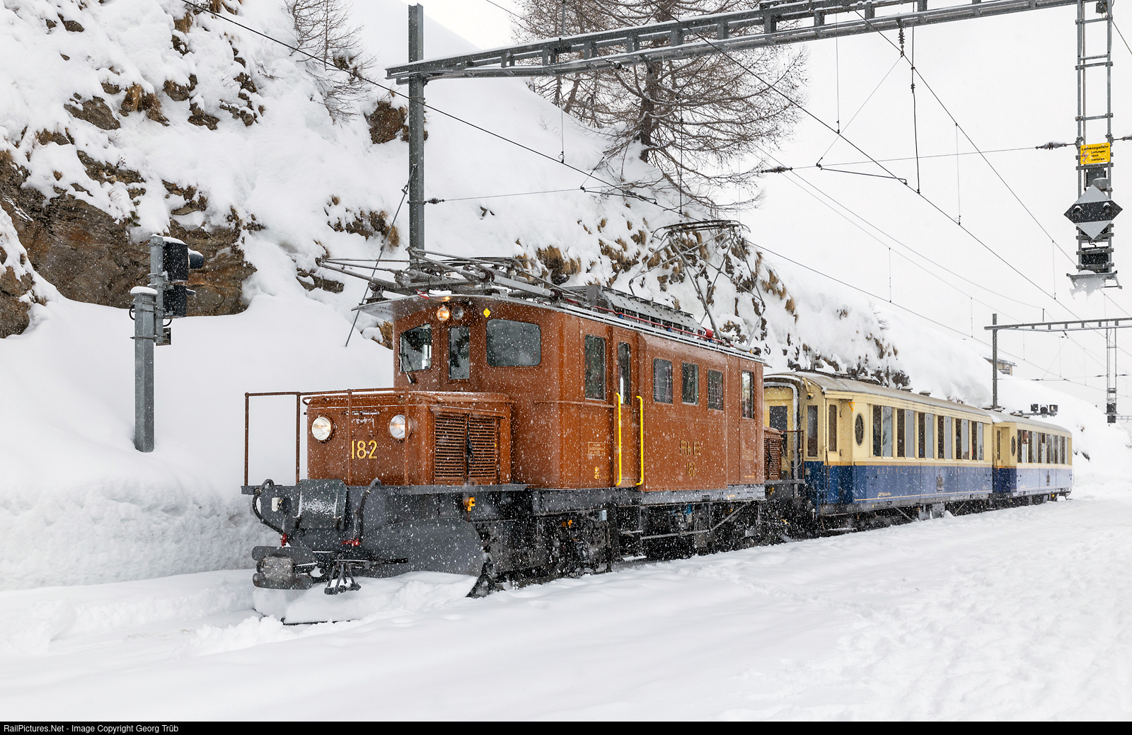 | The "Bernina Crocodile" Ge 4/4 # 182 of the Rhaetian Railway, owned by association Club 1889, pulls the pullman car train 92658 from St.Moritz over the Bernina line to Poschiavo and back, stopped in Alp Grüm. The 760 Hp locomotive was built in 1928 by SLM and SAAS for the then independent Bernina Railway and is based in Pontresina. |
