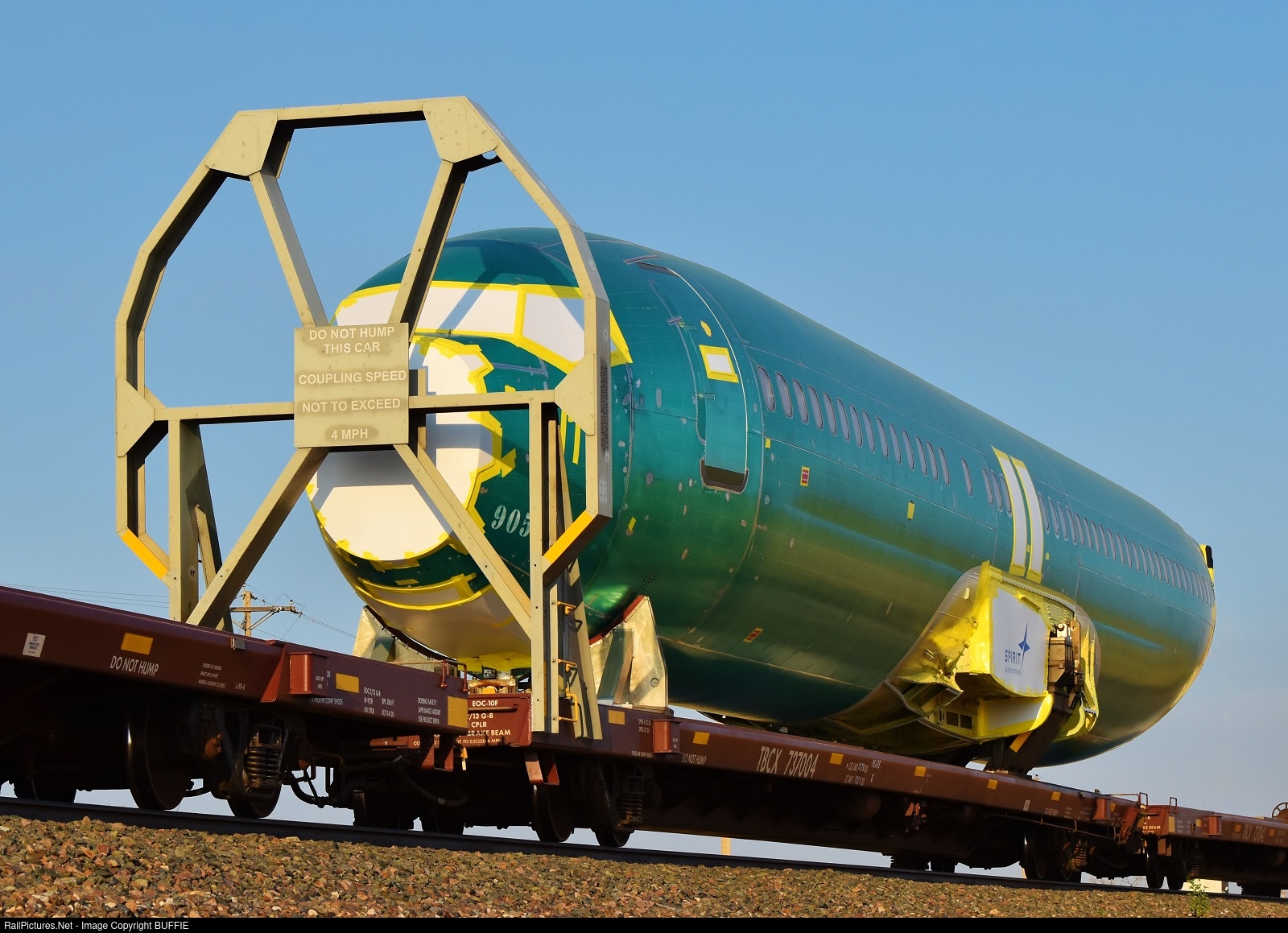 | A Boeing 737 fuselage secured to a special flat car runs through Roggen, Colorado, heading east on the Brush Sub.