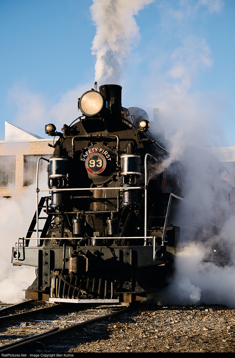 | NNRY 93 is enveloped in her own steam as she rolls out of the engine house at dawn. This is the first of three consecutive charter weekends at the railroad for the month. |