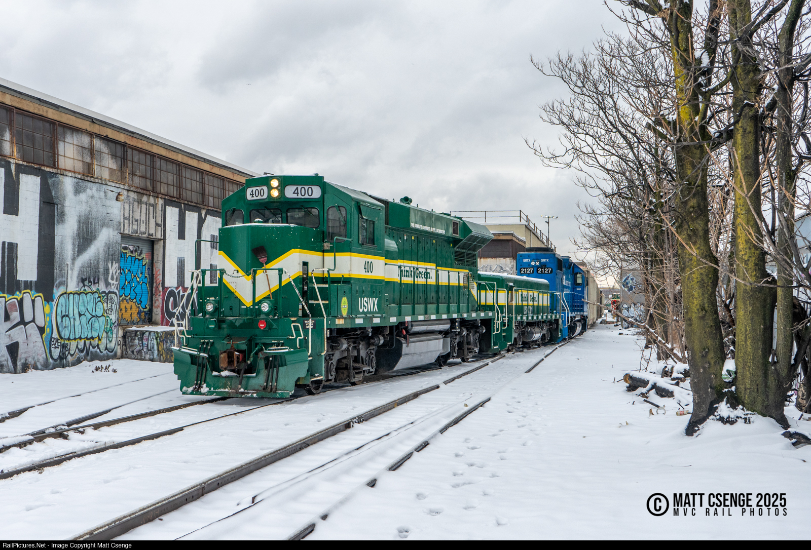 New York & Atlantic train RS-90 is seen creeping towards Morgan Ave as they take headroom to push empty cars into Cooper Recycling. Power for the Brooklyn / Queens local job today included USA Waste Services SE23B-M/S mother / slug set 400 and 010, as well as leased GP38-2 no. 2127. |