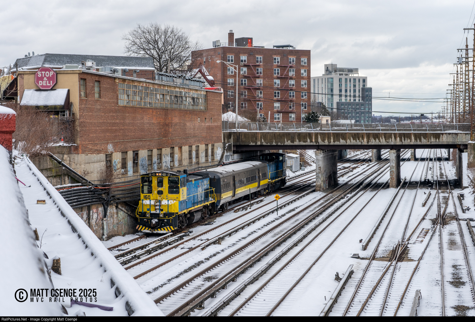 Winter Work at Woodside. Long Island Rail Road alcohol train ALQ1 is seen dipping between the overhead bridges in the Woodside neighborhood of Queens as it makes its way to Sunnyside Yard from Port Washington. The train is one of a handful used by the rail road during wintery weather to apply an alcohol solution to the third rail in order to prevent ice buildup that can lead to arcing, and is made up of MP15AC locomotives 168 and 171 bookending modified M3 car E901.