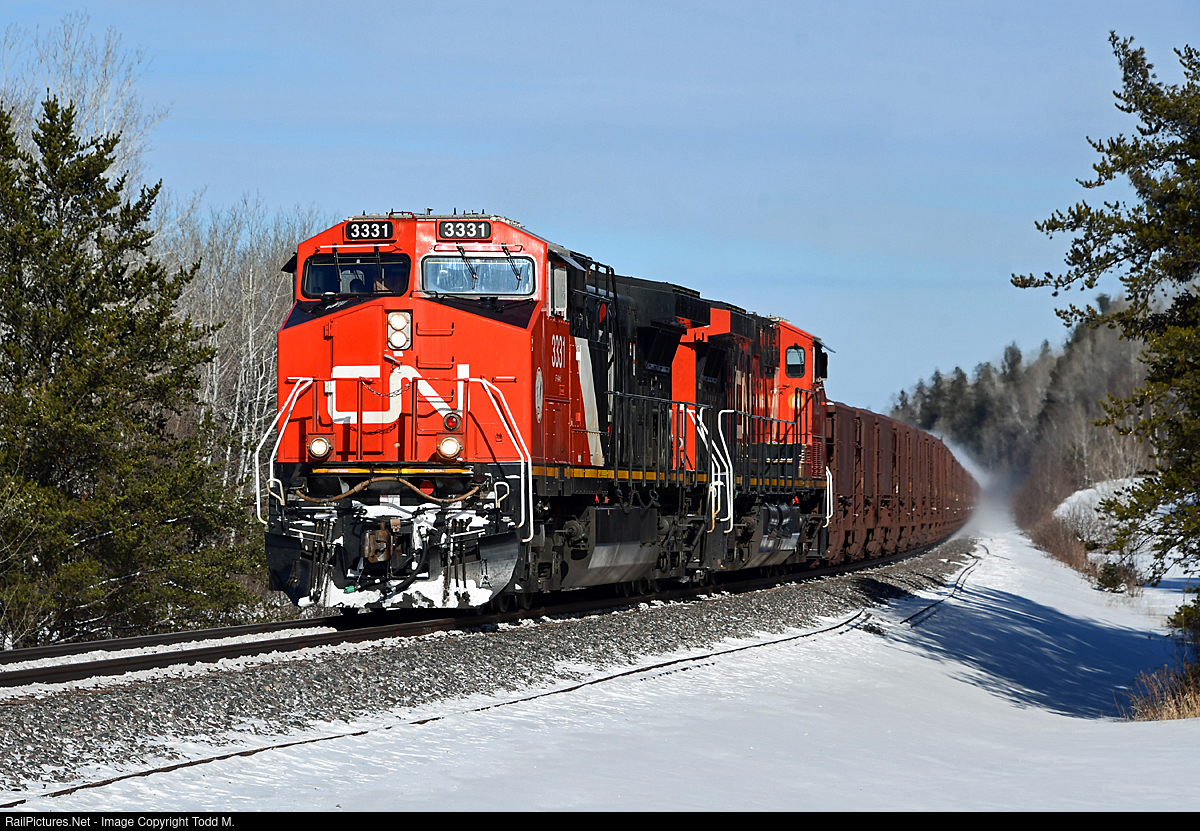 | Fresh made taconite pellets glide along the CN Missabe sub at Culver, MN as they head for Proctor yard. The leader, CN 3331, sports a special logo dating back to the Canadian Northern days. |