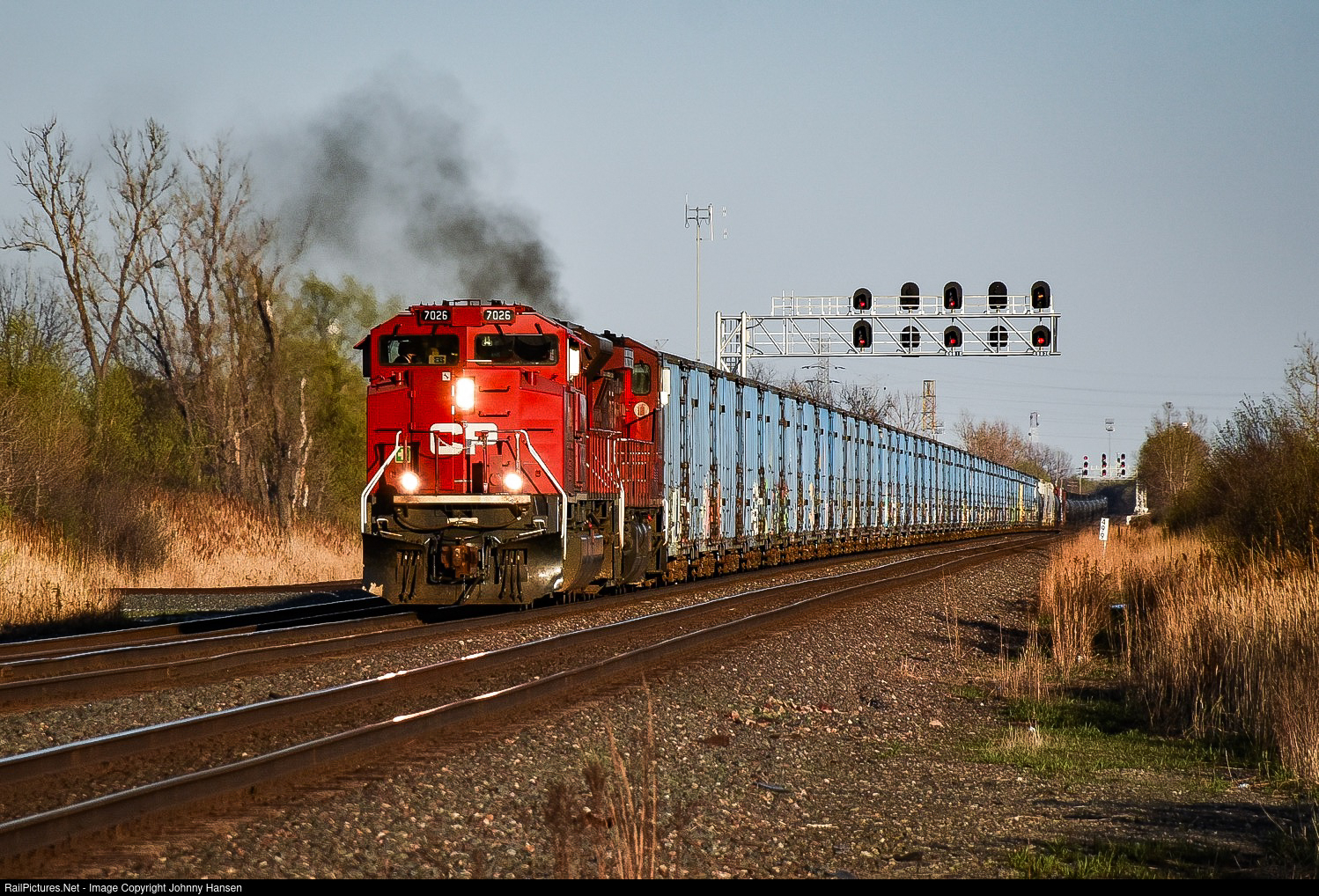 | During the beginning of golden hour, CP 651 gets up to speed as they head west at Pine Junction with a CP SD70ACU leading a GE, and 50 CMQ boxcars at the head end making for a neat touch. |