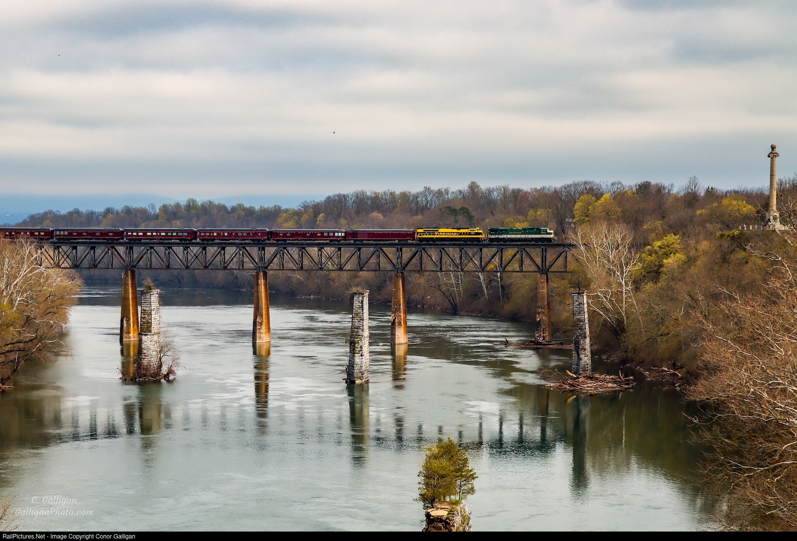 | Norfolk Southern Office Car Special 955 has just crosses the state line into West Virginia enroute to the Masters Golf Tournament. They are also crossing the Potomac River, to the right is the James Rumsey Monument. |