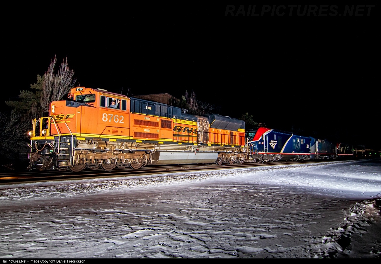 A tardy Empire Builder saunters out of the Glenview, IL station with BNSF 8762 (SD70ACe) providing help, with a friendly crew to boot.