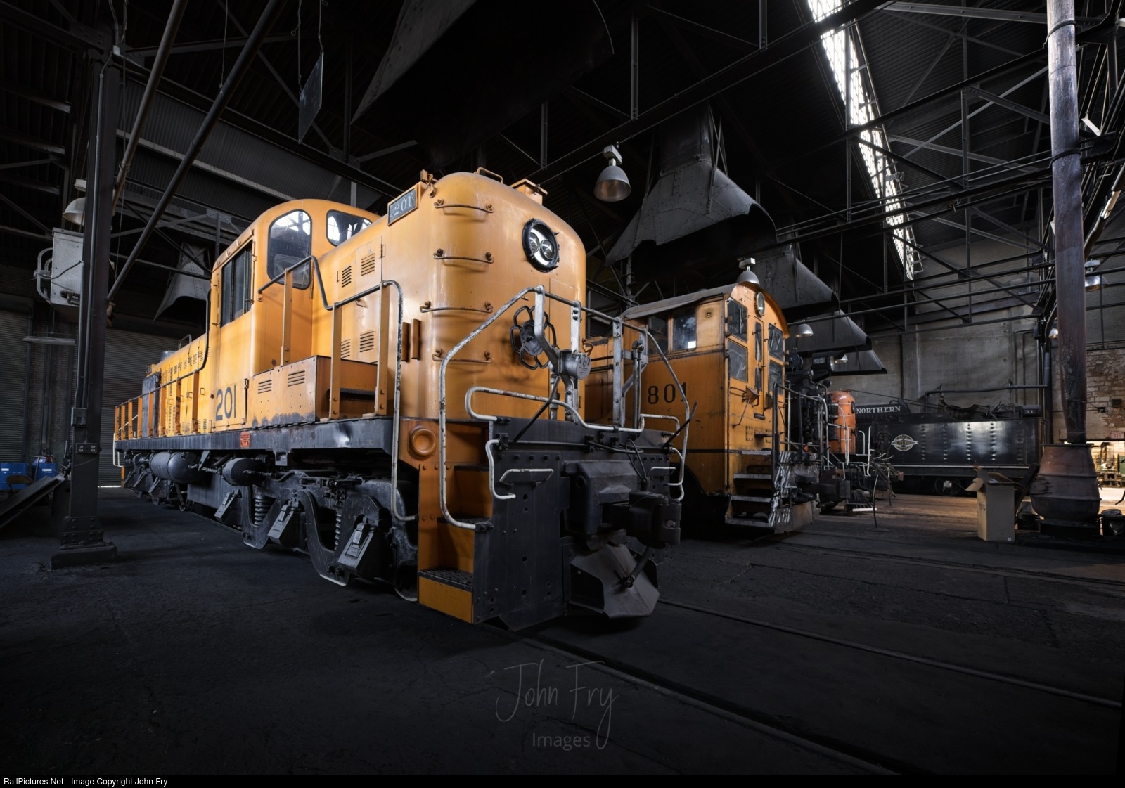| Everything was cold and static on a fall morning visit to Nevada Northerns shops. The last RSD-4 in existence, #201 waits among other stablemates for the next call to duty. |