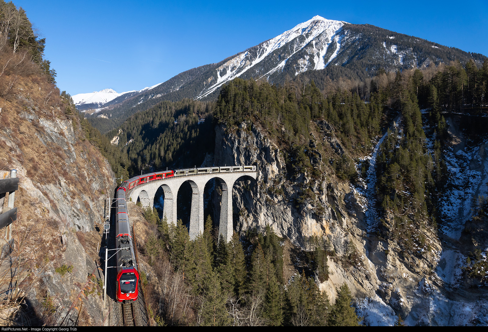 On this day, a composition of three coupled “Capricorn” ABe 4/16 trains was used on the Rhaetian Railway's Albula line instead of an ALVRA push-pull train with Ge 4/4 III. IR 1152 of the IR38 line from St. Moritz to Chur runs between Filisur and Alvaneu over the world famous 65 meter high Landwasser viaduct. The train consists of ABe 4/16 # 3143, # 3164 and the champagne-colored # 3133. On the left in the background is the Büelenhorn, on the right the Muchetta.