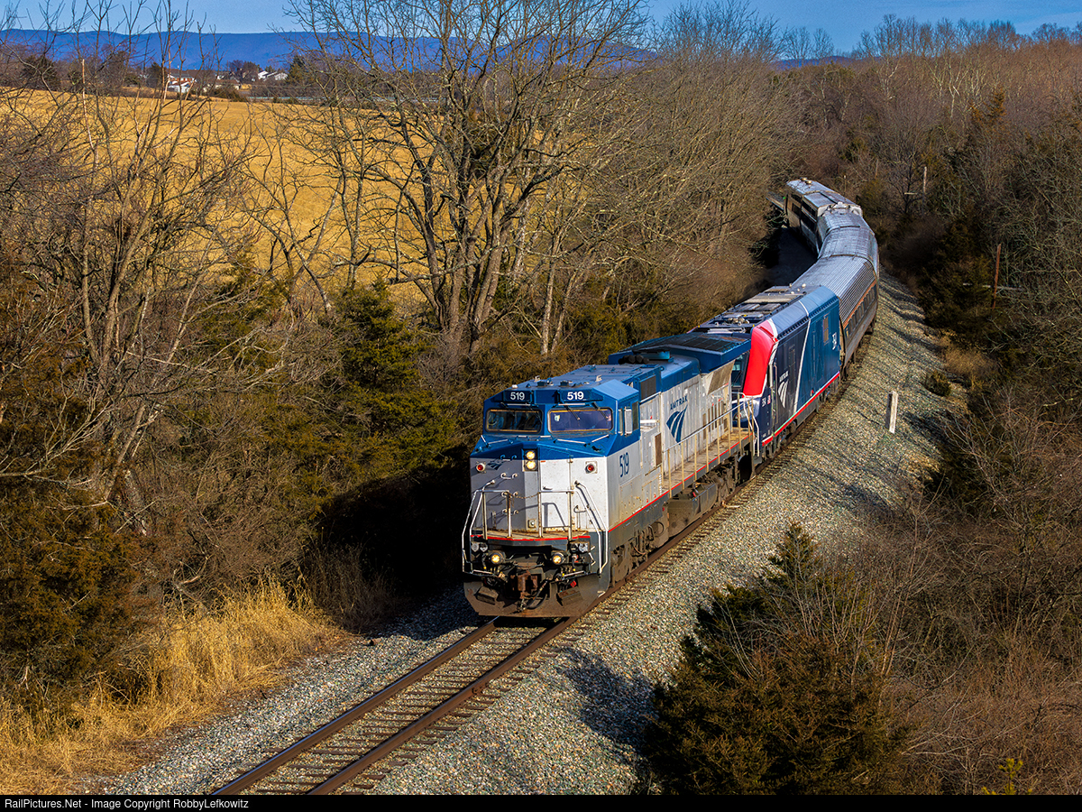 In a rare move in the 2020s, AMTK 519, a dash 8, leads the westbound Amtrak Cardinal along the Buckingham Branch through Fishersville, Virginia, just a few miles from its next station stop in Staunton, Virginia.