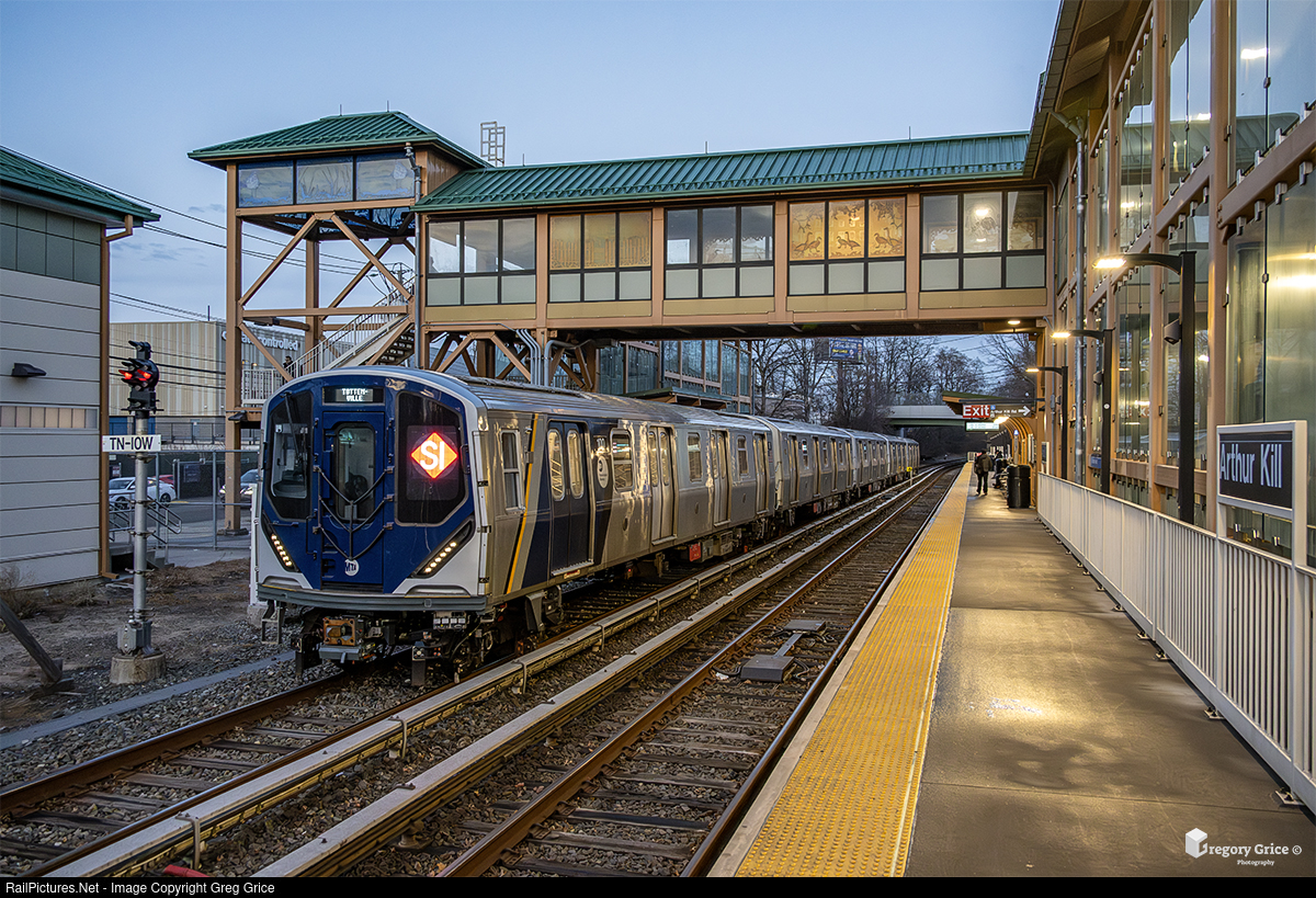 On the evening of February 3rd 2025, an eastbound MTA Staten Island Railway express train, with a 5-car Kawasaki R211S set, departs Arthur Kill station on Staten Island, New York.