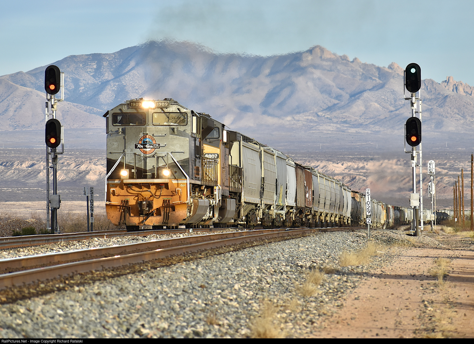 | UP's Rio Grande heritage unit leads the MHNPX up the heavy grade at Benson. The train was doing about 15 mph up the hill and all 3 units on the train were giving it all they had to keep the heavy manifest rolling |
