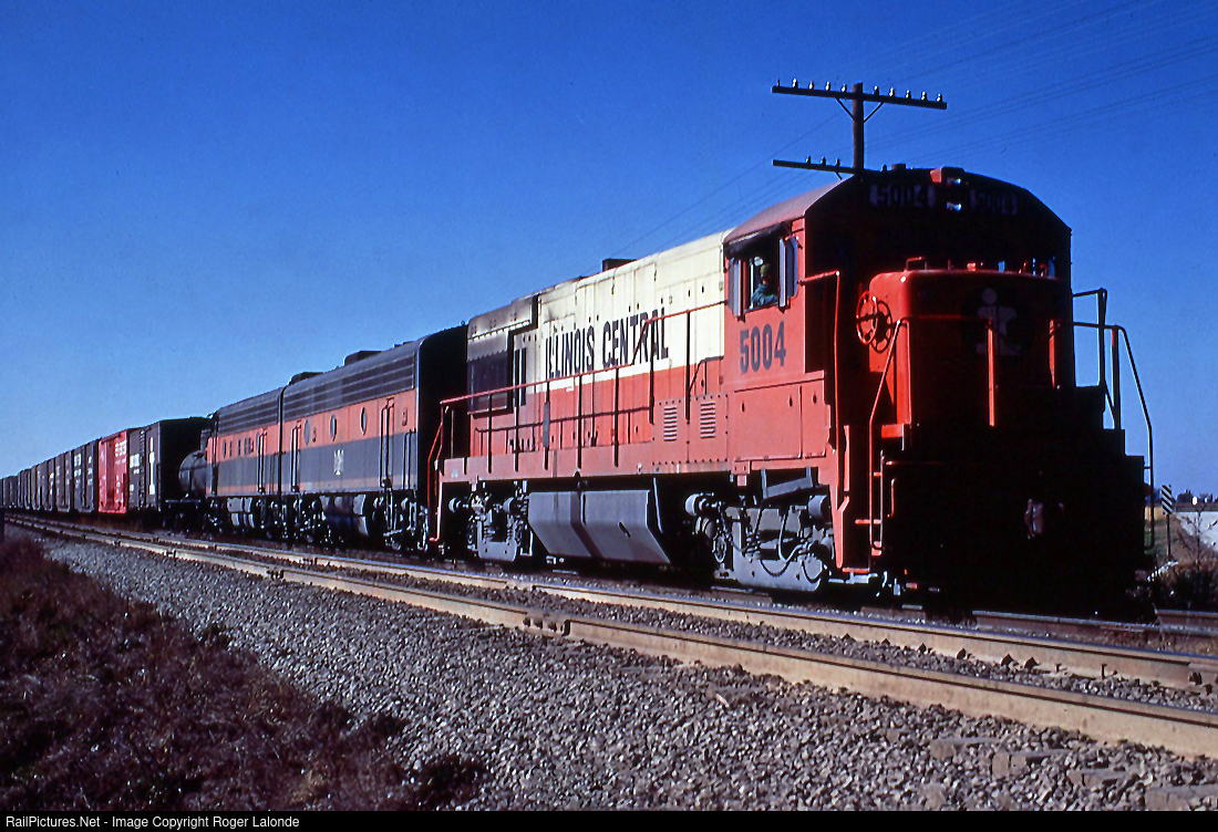 Illinois Central GE U30B 5004 with two leased B&LE F7 units leading a St. Louis-bound freight near Gilman, Illinois on October 12, 1969. Photo by R.R. Wallin, from my collection.