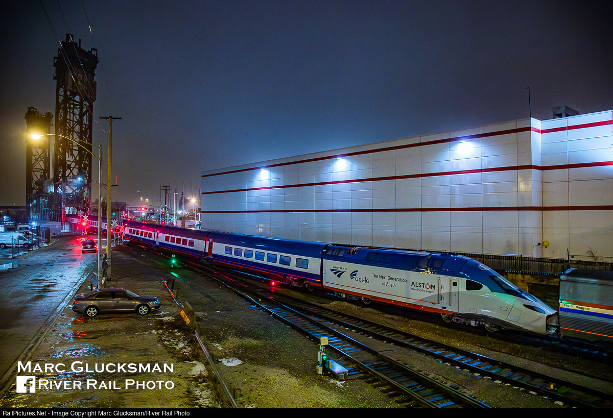 High Speed In Chicago. In the early morning hours of February 18, 2020, Amtrak Acela 2 Train Set 1 arrived in Chicago, Illinois on its way to Pueblo, Colorado for operational testing in the rain. AMTK 2100, the lead power car pictured here, was adorned with the emblems of both Amtrak and Alstom to recognize their cooperation on this project. This set has since tested and returned to the Alstom facility in Hornell, New York where it will be modified based upon the data collected and repainted before being delivered to Amtrak.