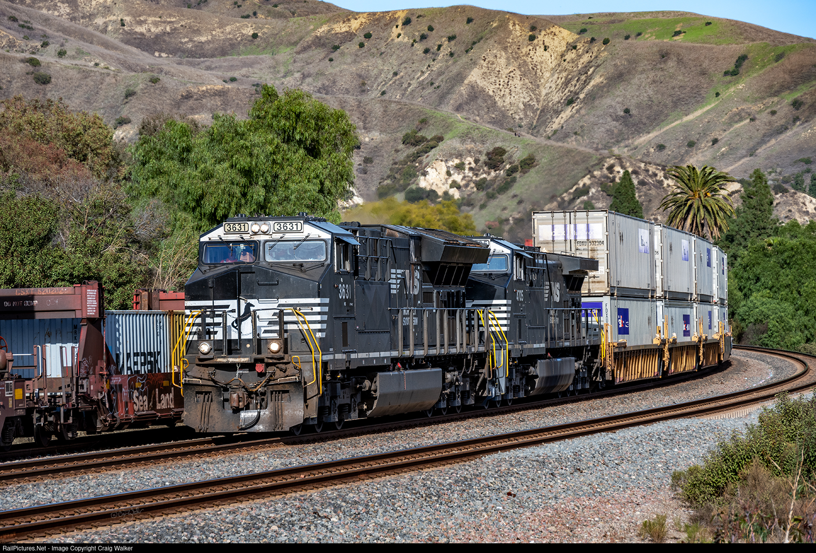 Burlington Northern Santa Fe's New York to Los Angeles intermodal train, Q-NYCLAC6-12A; very often has at least one Norfolk Southern diesel on it. On this day, it had two – NS ET44AC 3631 and AC44C6M 4705 (ex-NS Dash 9-44CW 9489) – the sole power on this day’s train, seen passing through Esperanza, a location on the BNSF's San Bernardino Sub. (Yorba Linda, California – February 16, 2025)
