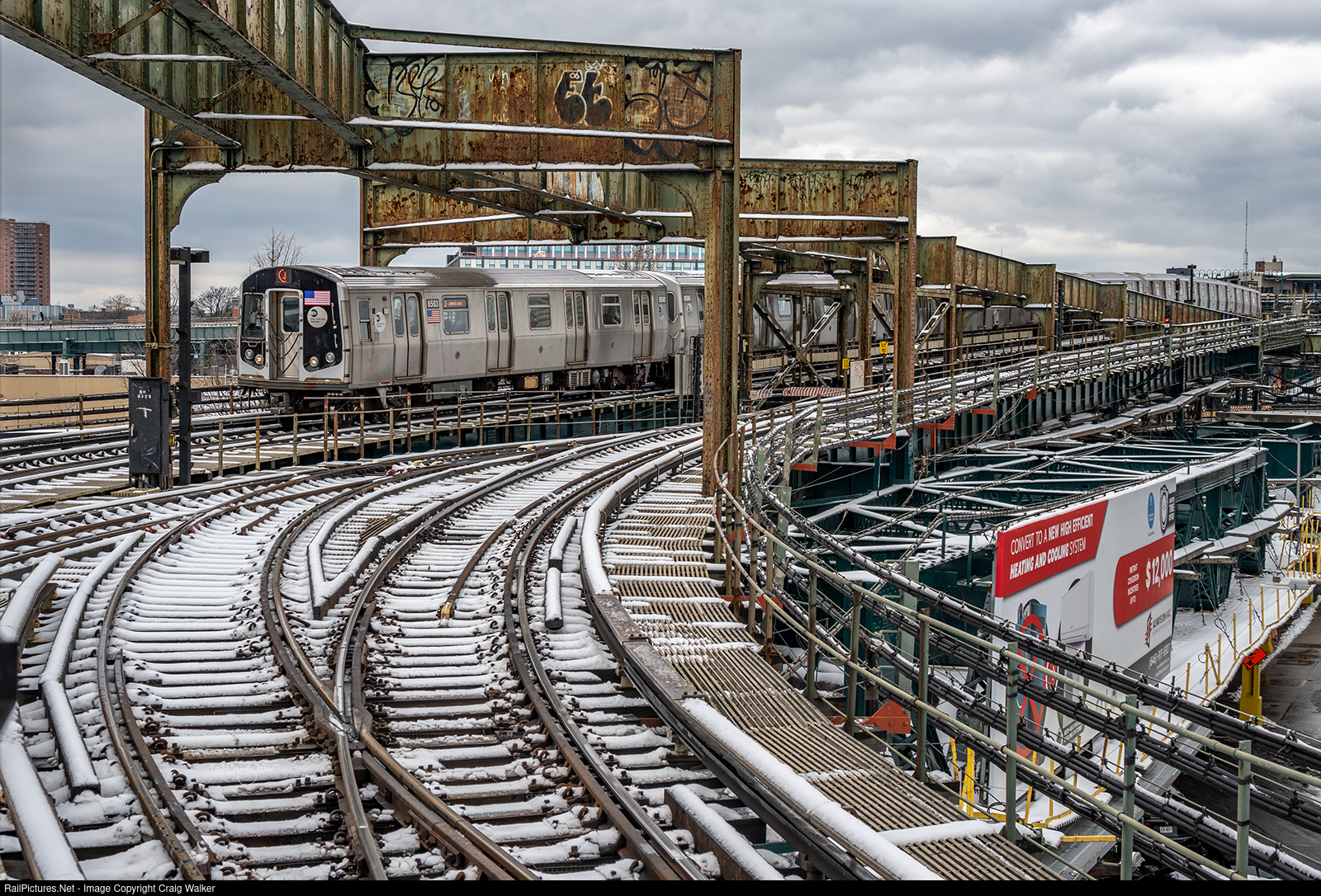 New York Metropolitan Transit Authority J Train – the Jamaica Local, comprised of Alstom R160A subway cars, connecting Manhattan’s Broad Street with Queens’ Jamaica Center–Parsons/Archer – has just departed the Broadway Junction station and is rolling into the line’s Alabama Street Station on a Sunday afternoon following a snowy morning. (Brooklyn, New York – February 9, 2025)