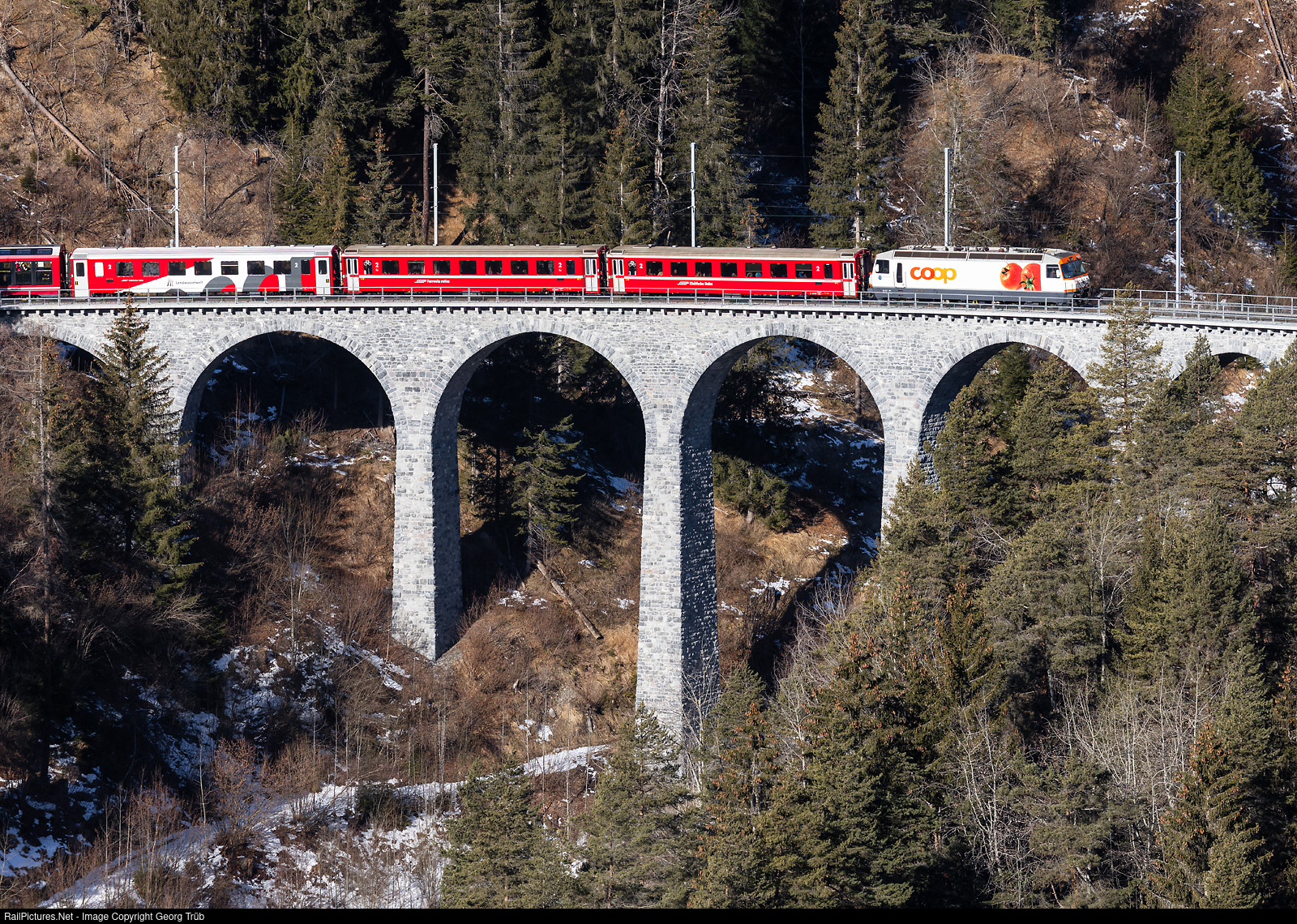 | Ge 4/4 III # 641 of the Rhaetian Railway in the COOP publicity paint scheme pulls the IR 1125 of the line IR38 from Chur to St.Moritz over the Schmittentobel viaduct between Alvaneu and Filisur. The train is reinforced with 3 second class standard cars type II in front. Third car has the special "Landwasserwelt" paint scheme and will be part of the new "Landwasser Shuttle" between Filisur and Alvaneu in summer 2025. |