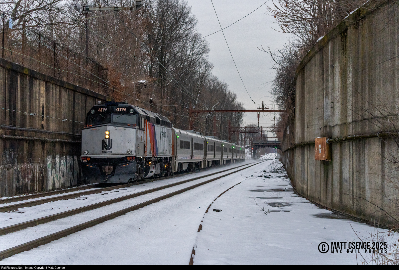 NJ Transit F40PH-2CAT no. 4119 is seen leading Montclair-Boonton Line train 1079 towards Watsessing Avenue Station. The curve in the wall at right here was for a now-abandoned freight siding, the right-of-way for which still exists behind a curtain wall at the station. Just above the locomotive is where the former NY&GL Orange Branch crossed overhead. |
