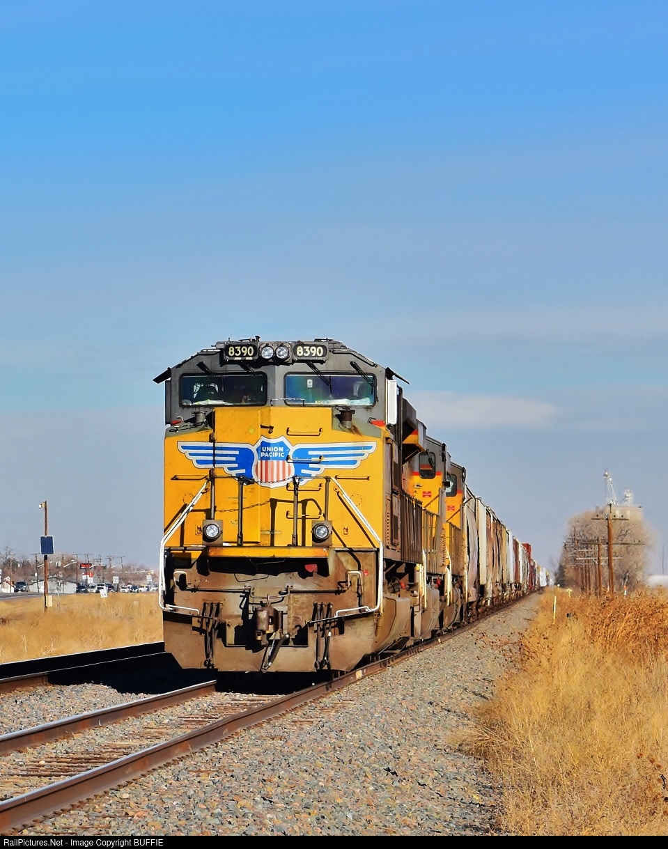 | UP 8390 (SD70ACe) waits on a siding in Platteville, Colorado for a northbound freight, and then will proceed south to Denver on the Greeley Sub.