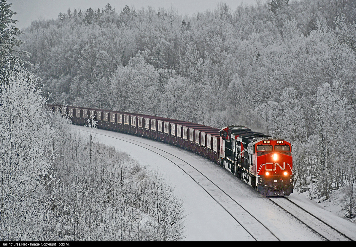 | Quietly gliding along the CN Iron Range Sub these rebuilt GE's and new ore cars are much stealthier than the SD40's and the cars they used to pull through here but it's the red CN nose that makes them stick out.