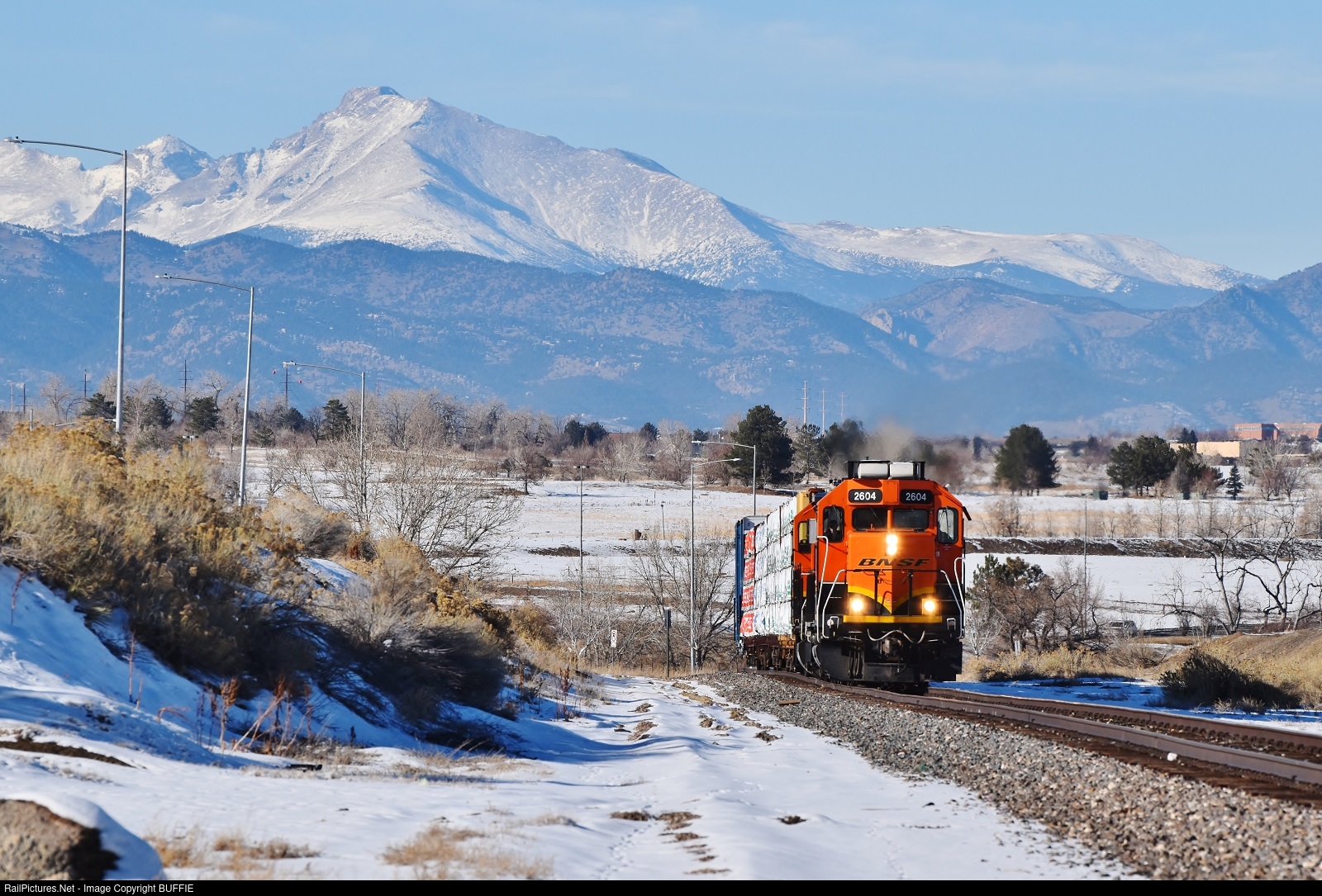 The Rocky Mountains have fresh snow on the peaks as BNSF 2604 (GP39-3) pulls a short freight towards Lafeyette, Colorado.