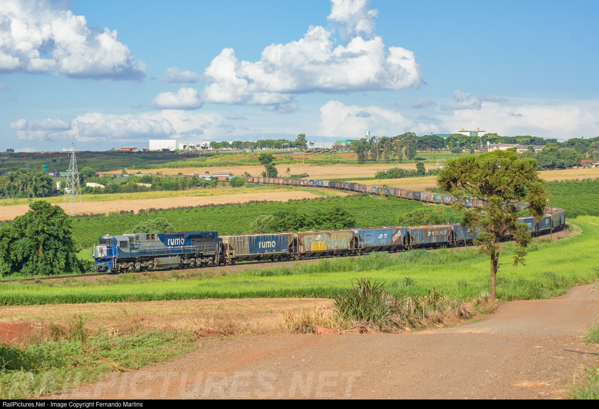 On the warm afternoon of February 22, 2025, a Rumo Logística freight bound for Paranaguá, PR, heads through the coffee and soybean fields, arriving near Mandaguari, PR. The train with 109 freight cars loaded with soybeans is helped by GE ES43BBi No. 645.