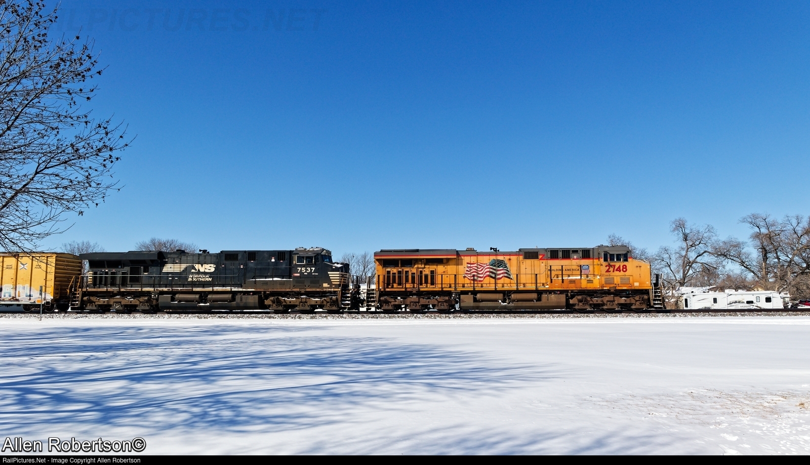 UP 2748 & NS 7537 lead an eastbound mixed freight.