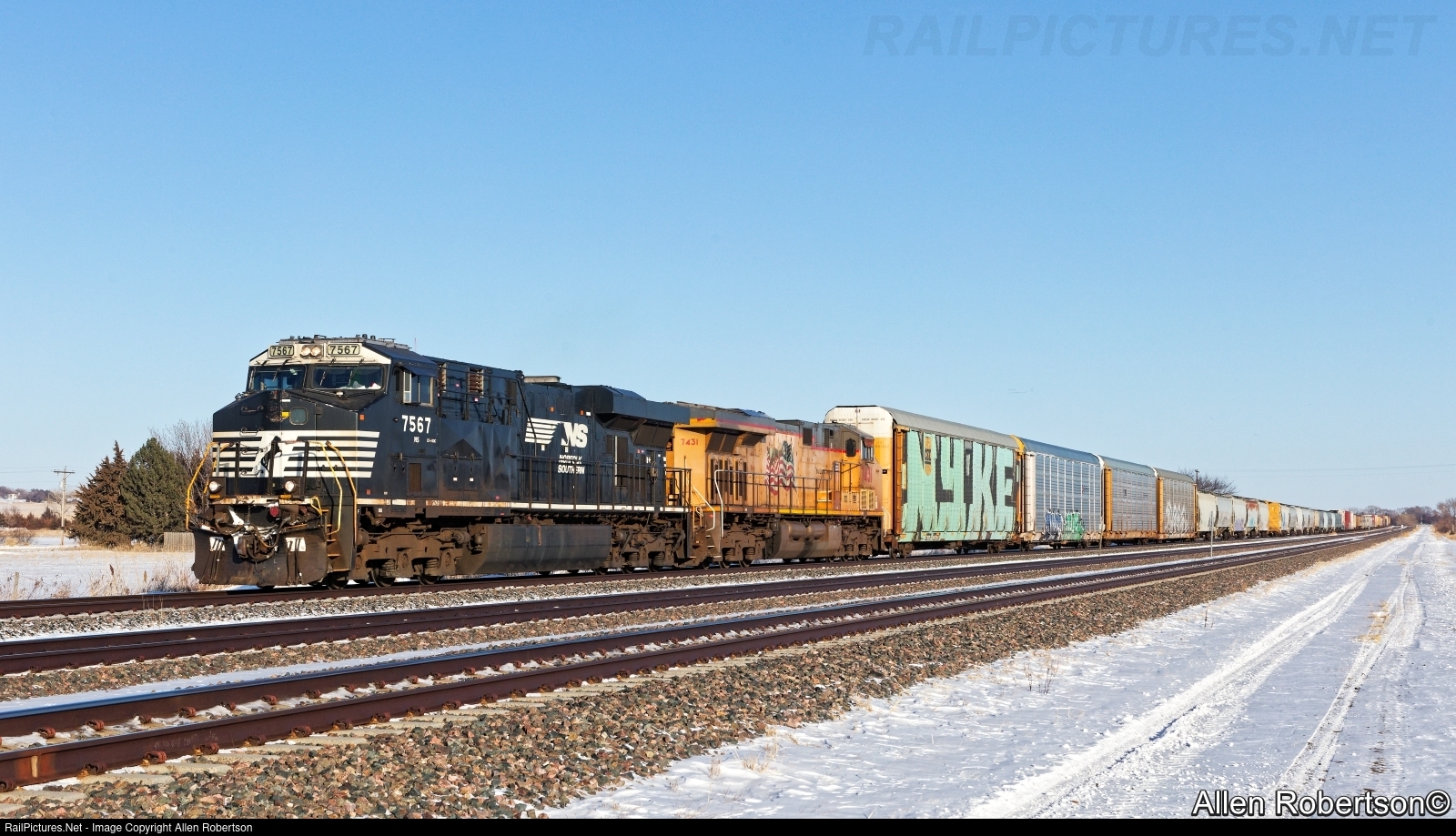 NS 7567 & UP 7431 power a westbound mixed freight.