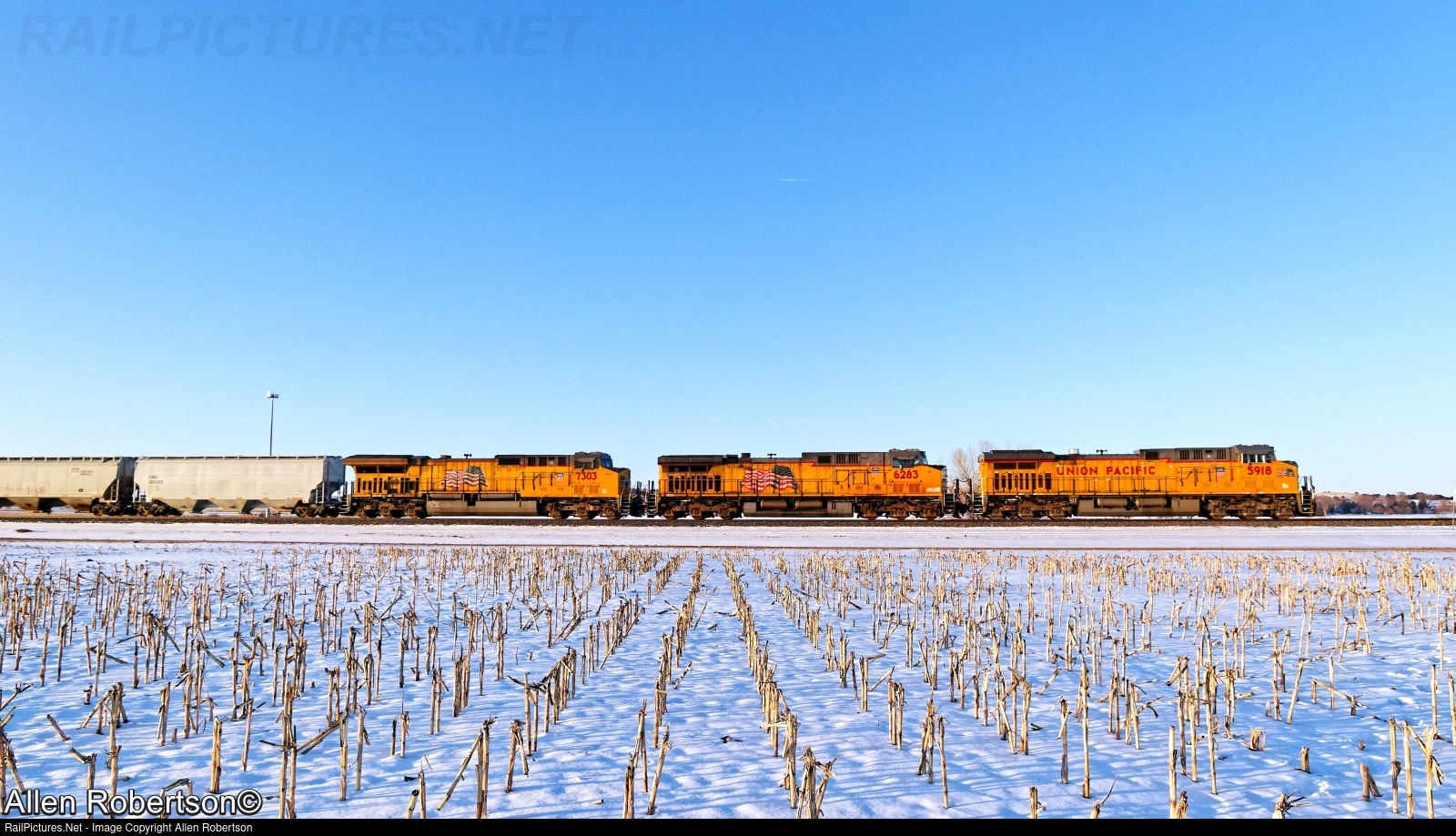 UP 5918, 6283, & 7303 power an eastbound grain train.