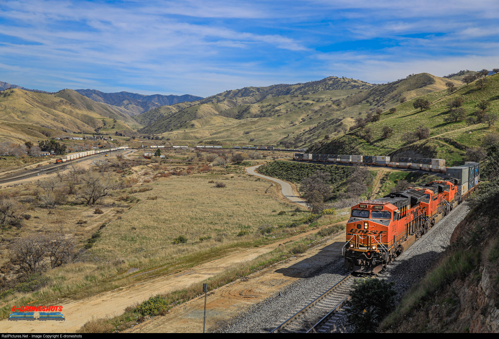| Rounding the horseshoe curve at Caliente, BNSF 3812 leads a stack train at ease up grade towards Tehachapi. |