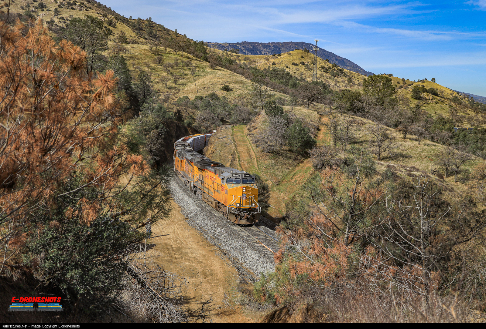 | Snaking thru the sharp curves of the Tehachapi Grade, UP 5895 leads a long manifest thru the mountains of California. |