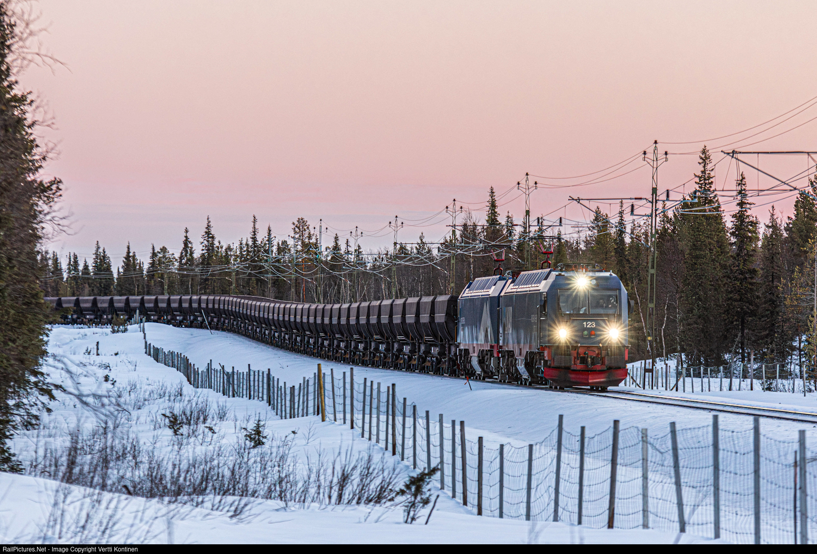 | The sun is setting when an empty 68 car long LKAB iron ore train from Luleå to Koskullskulle in Gällivare is seen approaching the meeting track at Ripats some 50km (30miles) north of the arctic circle. Leading the train are Iore locomotives 123 "Riksgränsen" and 101 "Polcirkeln". All 34 Iore locomotives are named after stations along the Malmbanan and Ofotbanen rail lines linking the iron ore mines at Kiruna and Gällivare to the ports of Narvik and Luleå.