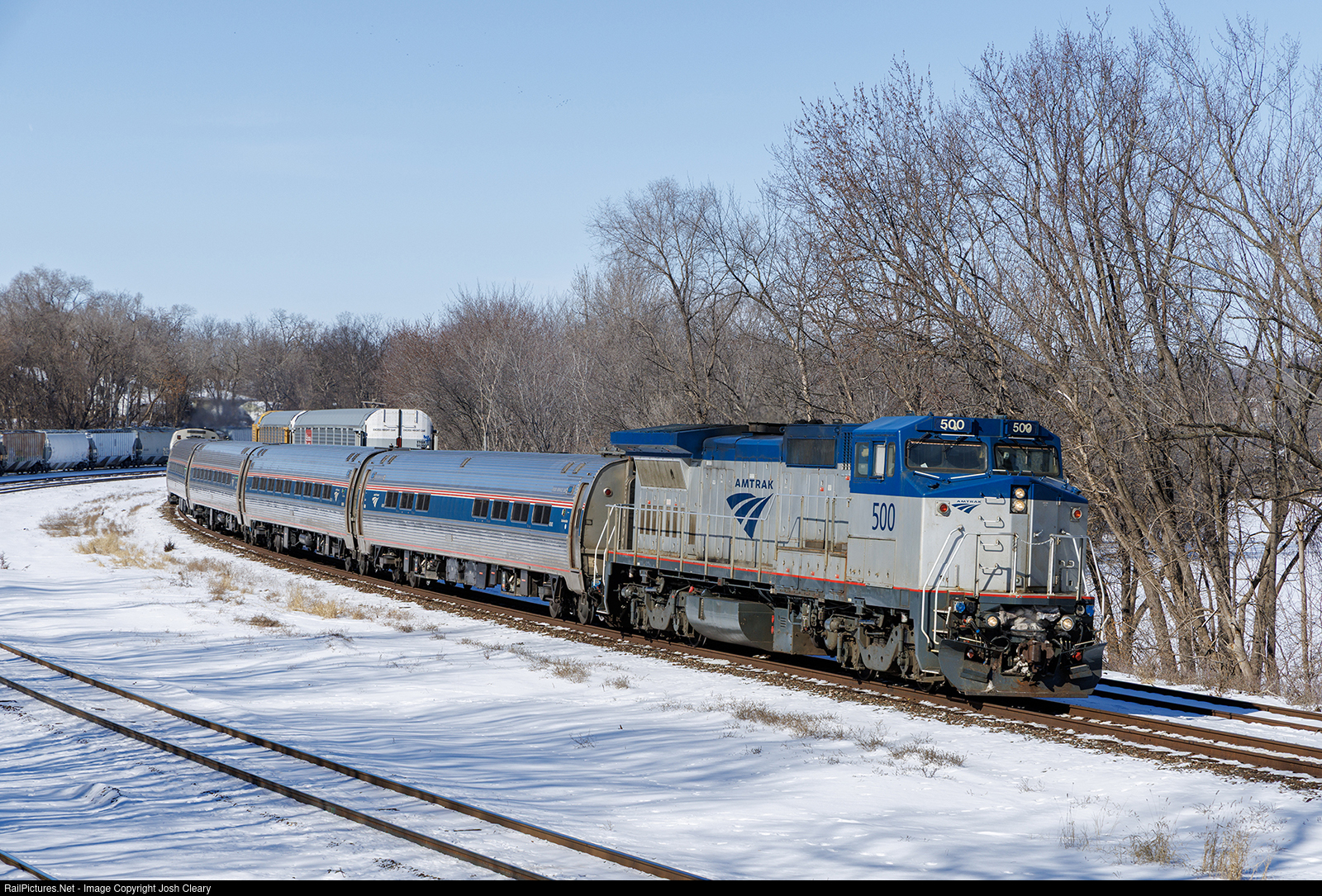 | Amtrak's class Dash 8 leads the Borealis through Hastings. Due to toilet freezing difficulties with the Horizon cars, Amtrak has been forced to use Amfleet and Superliner sets for the Borealis recently. They also continue to be plagued with locomotive challenges, and the typically yard assigned B32-8WHs have been a common sight on the Borealis throughout the winter. |