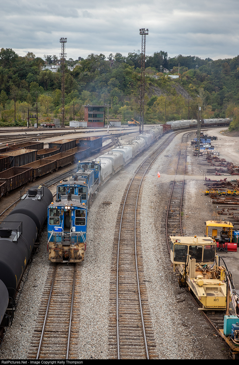 | A trio of blue URR switchers brings a northbound through Duquesne Yard. The train will eventually head across the Monongahela River. |