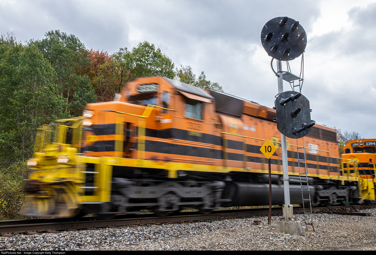 BPRR 3328 leads its train off the B&O and onto the former PRR Buffalo Line at Machias. Here we see the train passing the former PRR signaling that has been turned.
