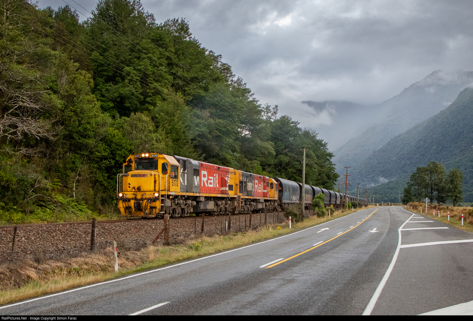 | DXC's 5172 and 5454 lead another load of coal up the grade near Aickens in the Otira Valley. This morning there is plenty of cloud hanging around the mountain tops of the Southern Alps adding to the spectacle of the area. |