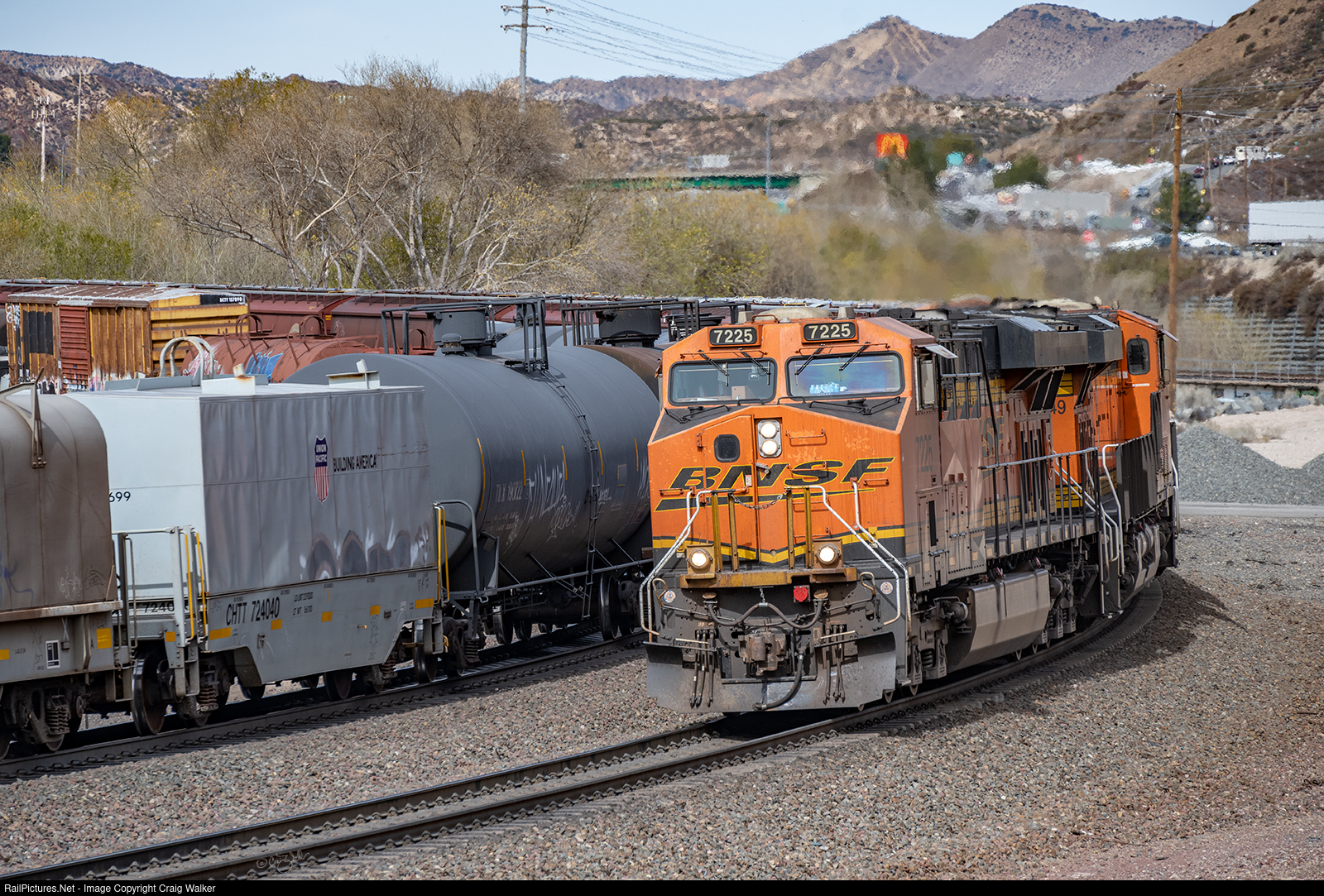 As Union Pacific train UP MWCNP-16 (a West Colton CA to North Platte NE manifest) climbs Cajon Pass on BNSF Cajon Sub's Main 1, BNSF High Priority Freight H-BARSDG3-16A, running a mere 15½ hours behind schedule, has just circumnavigated Sullivan's Curver as it rolls into Cajon on its way from Barstow to San Diego. (With Barstow being just 62 miles away, how is this train already over 15 hours late? It's today's railroading ... don't ask such questions!) BNSF ES44DC 7225, plus ES44C4s 8049 and 8078, are powering this freight. Two trains with no intermodal on Cajon? What a nice break from the usual... (Cajon Pass, California - February 16, 2025)