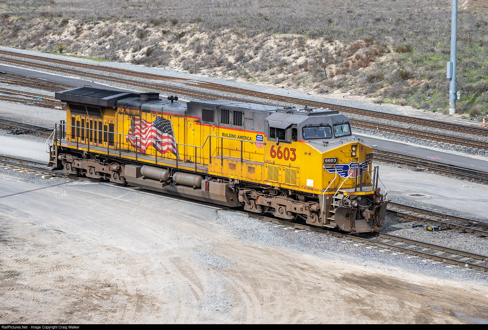 Union Pacific eastbound train E-WCLLF-16 departs the railroad's West Colton Yard ... all by itself. UP AC4400CW 6603 was sent out to rescue West Colton CA to Tucson AZ train M-WCTU-16, which suffered the failure of one of its diesels in Loma Linda, a mere 7 miles into its journey, apparently leaving the train short a few thousand horsepower to get over Beaumont Hill (as.well as all the other grades it would encounter on its way to Tucson). Fortunately, West Colton's engine facility has plenty of power on hand to spare. (Colton, California – February 16, 2025)